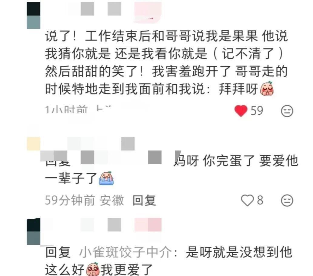 拍摄结束后,她和成毅说自己是果果,成毅说“我猜你就是”,然后甜甜的笑了!我隔着屏幕都有点羡慕她了,一眼就被自家哥哥认了出来,成毅走的时候还特地走到她面前和她说“拜拜呀”,这谁能顶的住啊,真的要爱他一辈子了!